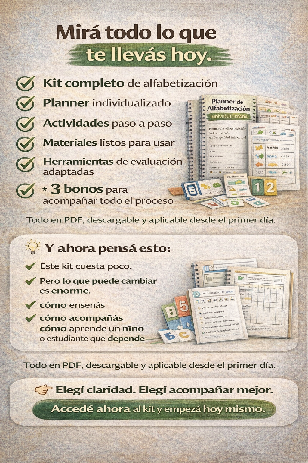 Además de la Guía Práctica para Alfabetizar Personas con Discapacidad, hoy accedés sin costo extra a estos bonos pensados para facilitarte todo el proceso 👇